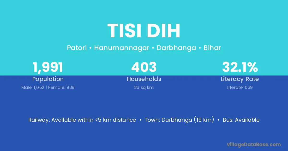 Darbhanga (19 km) is the nearest town to Tisi Dih village for major economic activities and is located approximately 19 km away.