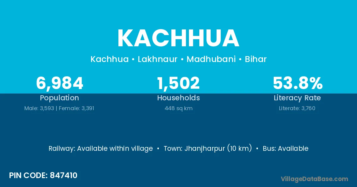 Darbhanga (34 km) is the nearest town to Kachhua village for major economic activities and is located approximately 34 km away.