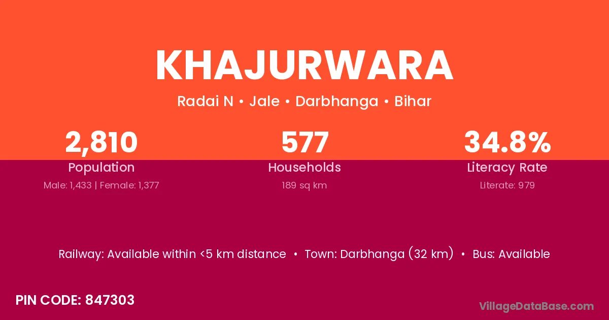 Darbhanga (32 km) is the nearest town to Khajurwara village for major economic activities and is located approximately 32 km away.