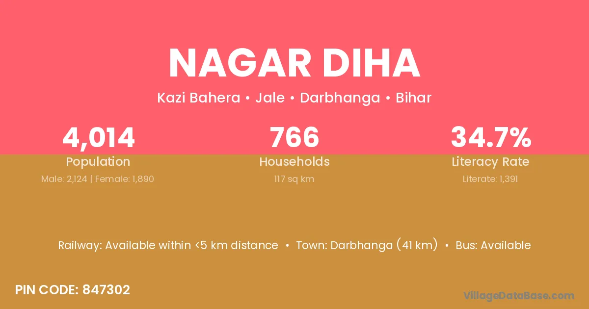 Darbhanga (41 km) is the nearest town to Nagar Diha village for major economic activities and is located approximately 41 km away.