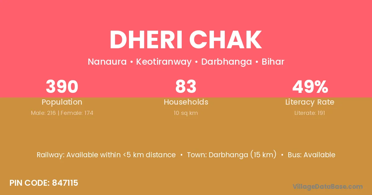Darbhanga (15 km) is the nearest town to Dheri Chak village for major economic activities and is located approximately 15 km away.