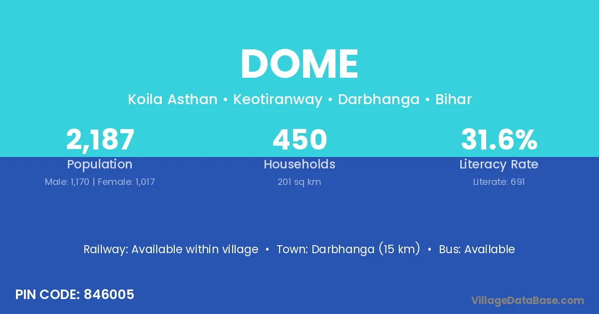 Darbhanga (15 km) is the nearest town to Dome village for major economic activities and is located approximately 15 km away.