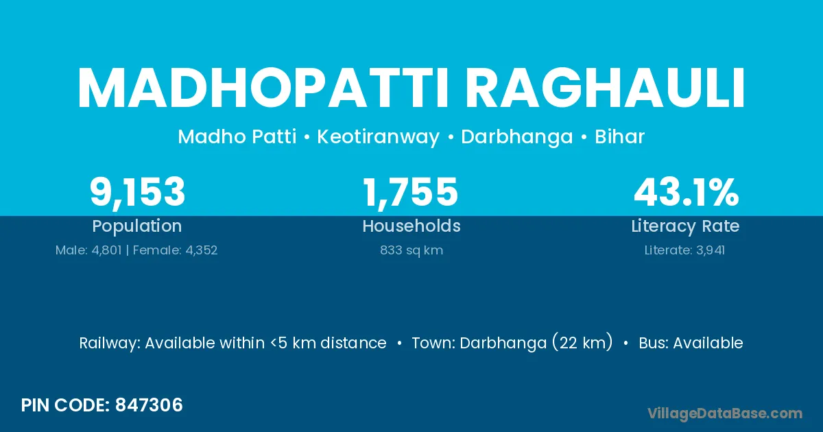 Darbhanga (22 km) is the nearest town to Madhopatti Raghauli village for major economic activities and is located approximately 22 km away.
