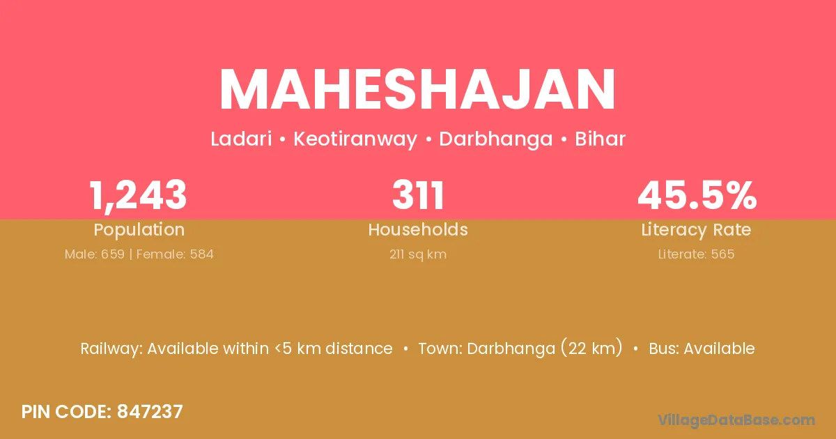 Darbhanga (22 km) is the nearest town to Maheshajan village for major economic activities and is located approximately 22 km away.