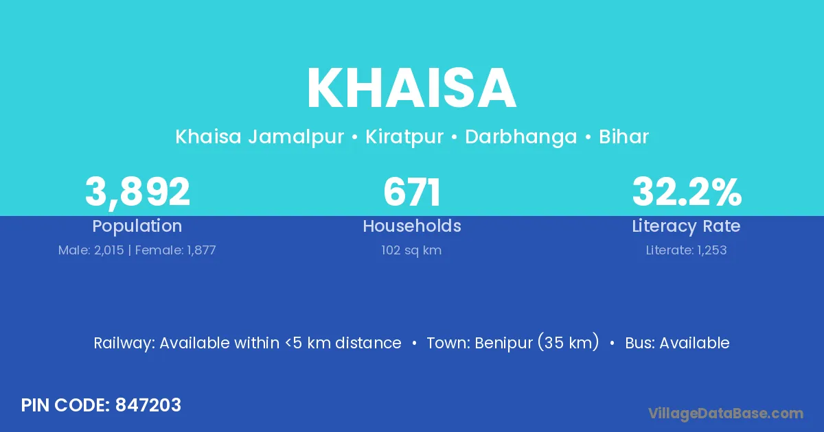 Benipur (35 km) is the nearest town to Khaisa village for major economic activities and is located approximately 35 km away.