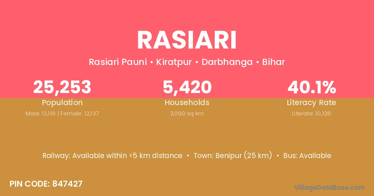 Benipur (25 km) is the nearest town to Rasiari village for major economic activities and is located approximately 25 km away.