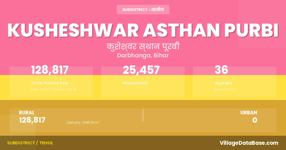 According to the 2011 census The total area of Kusheshwar Asthan Purbi Subdivision is 103 km², with a population of 128817 people. The population density is 1,246 inhabitants per square kilometre, and there are approximately 25457 houses in the sub district.