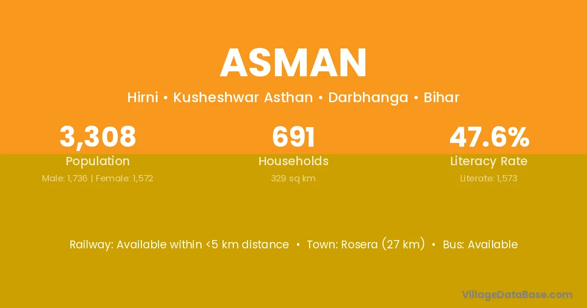 Rosera (27 km) is the nearest town to Asman village for major economic activities and is located approximately 27 km away.
