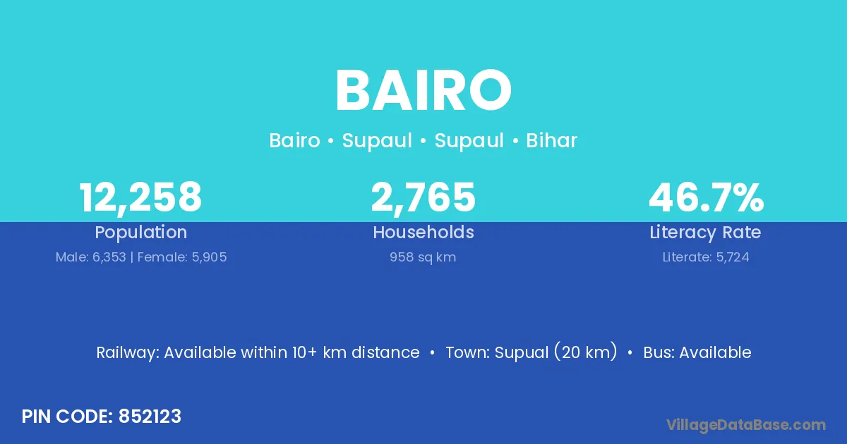 Rosera (28 km) is the nearest town to Bairo village for major economic activities and is located approximately 28 km away.