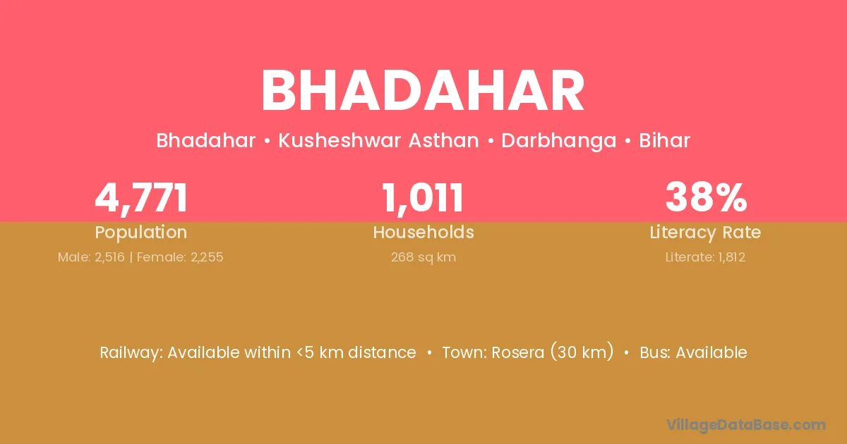 Rosera (30 km) is the nearest town to Bhadahar village for major economic activities and is located approximately 30 km away.