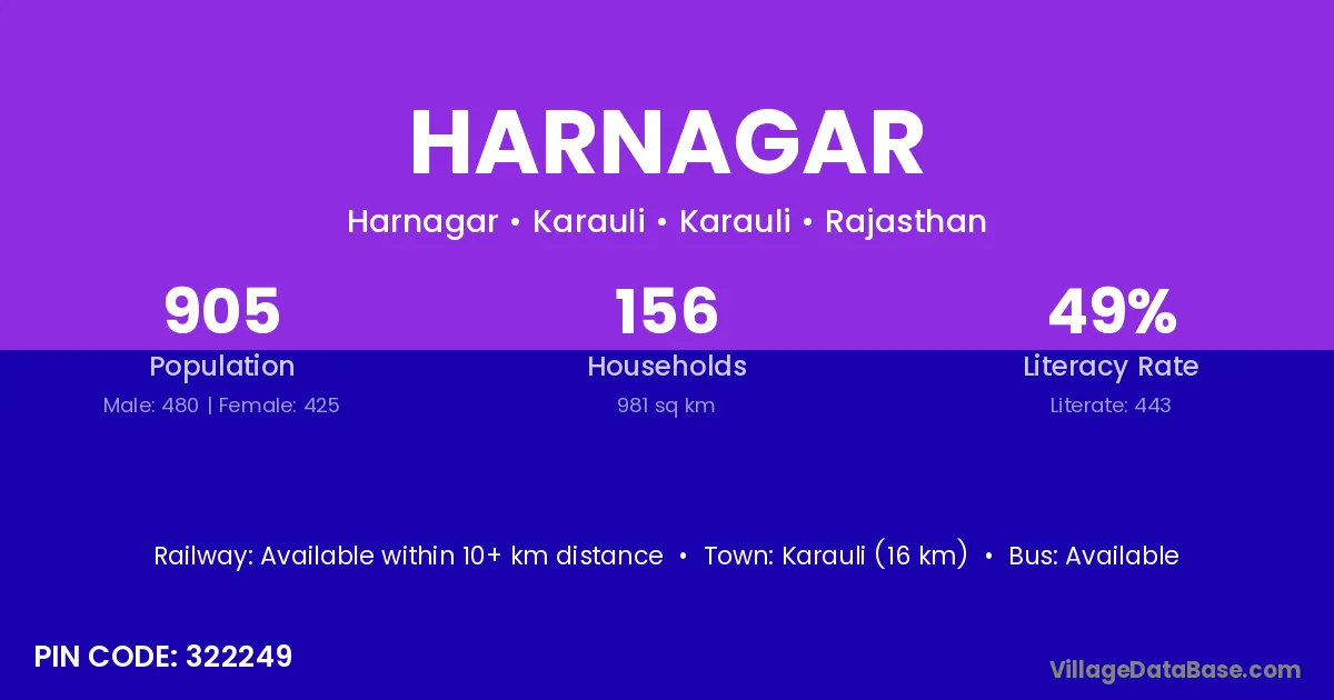 Rosera (22 km) is the nearest town to Harnagar village for major economic activities and is located approximately 22 km away.