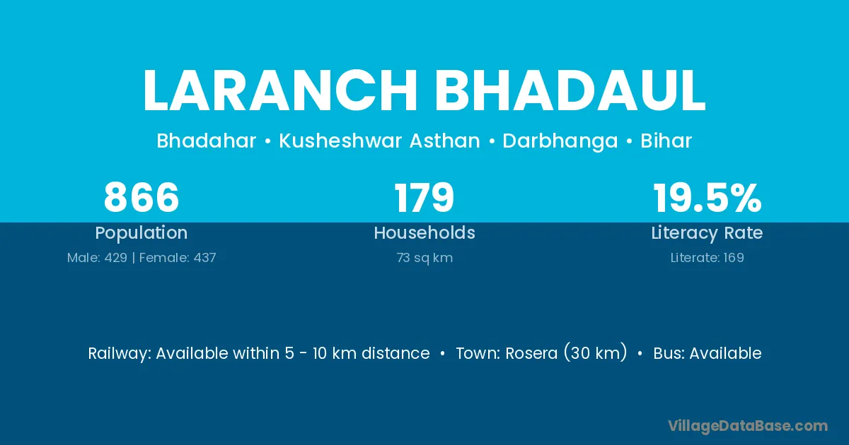 Rosera (30 km) is the nearest town to Laranch Bhadaul village for major economic activities and is located approximately 30 km away.