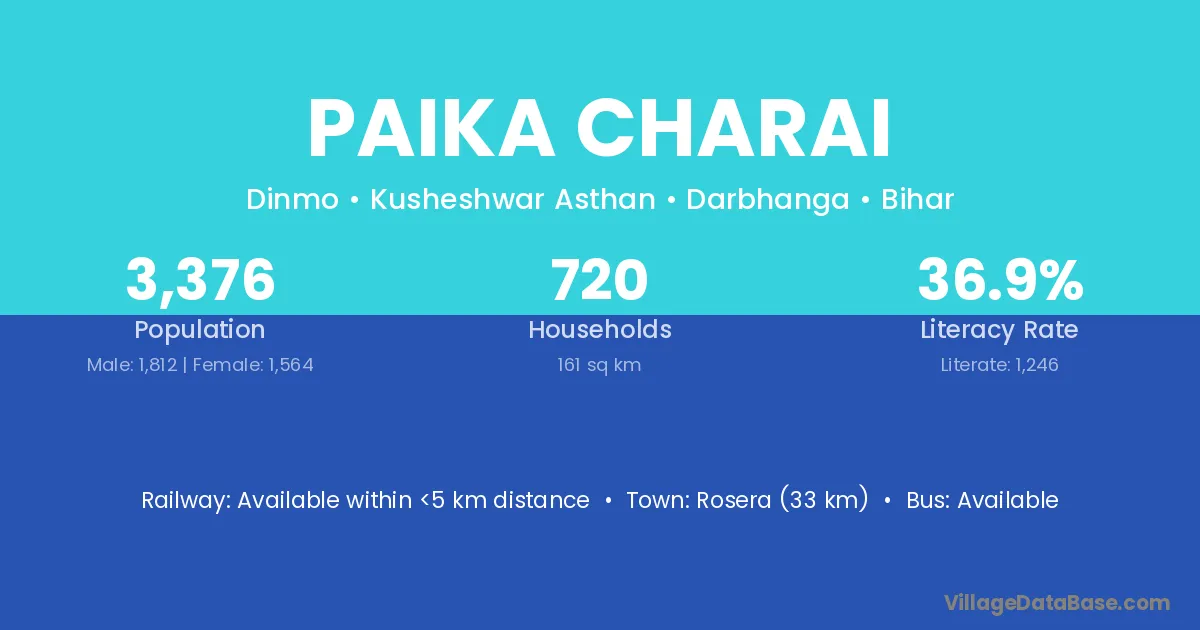 Rosera (33 km) is the nearest town to Paika Charai village for major economic activities and is located approximately 33 km away.