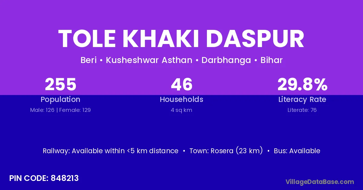 Rosera (23 km) is the nearest town to Tole Khaki Daspur village for major economic activities and is located approximately 23 km away.