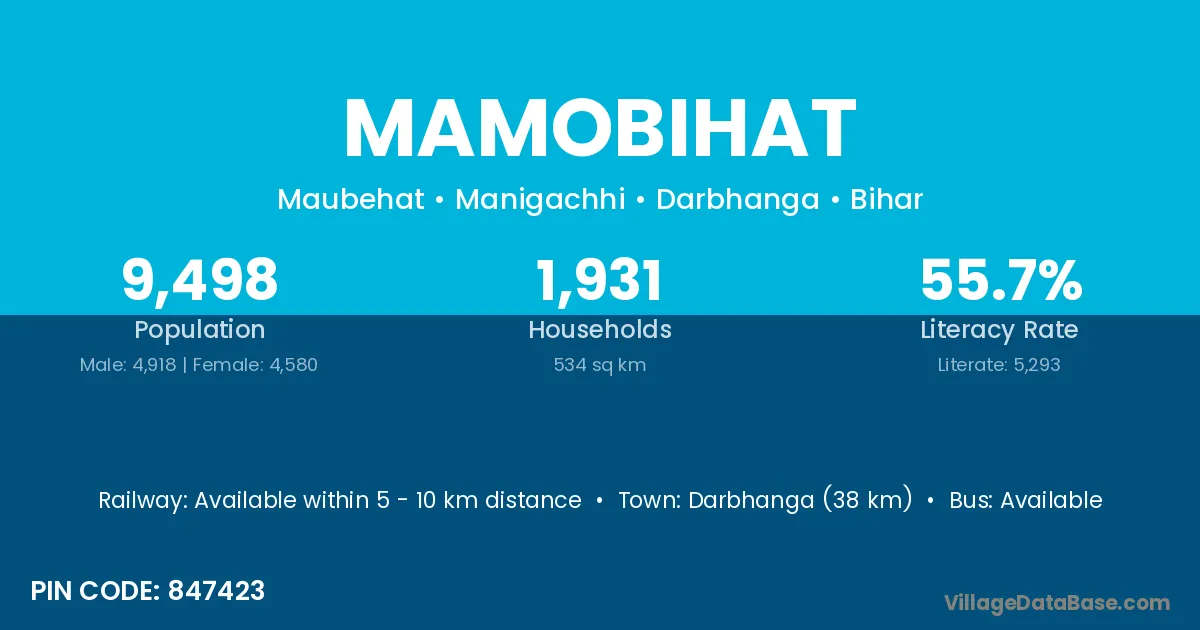Darbhanga (38 km) is the nearest town to Mamobihat village for major economic activities and is located approximately 38 km away.