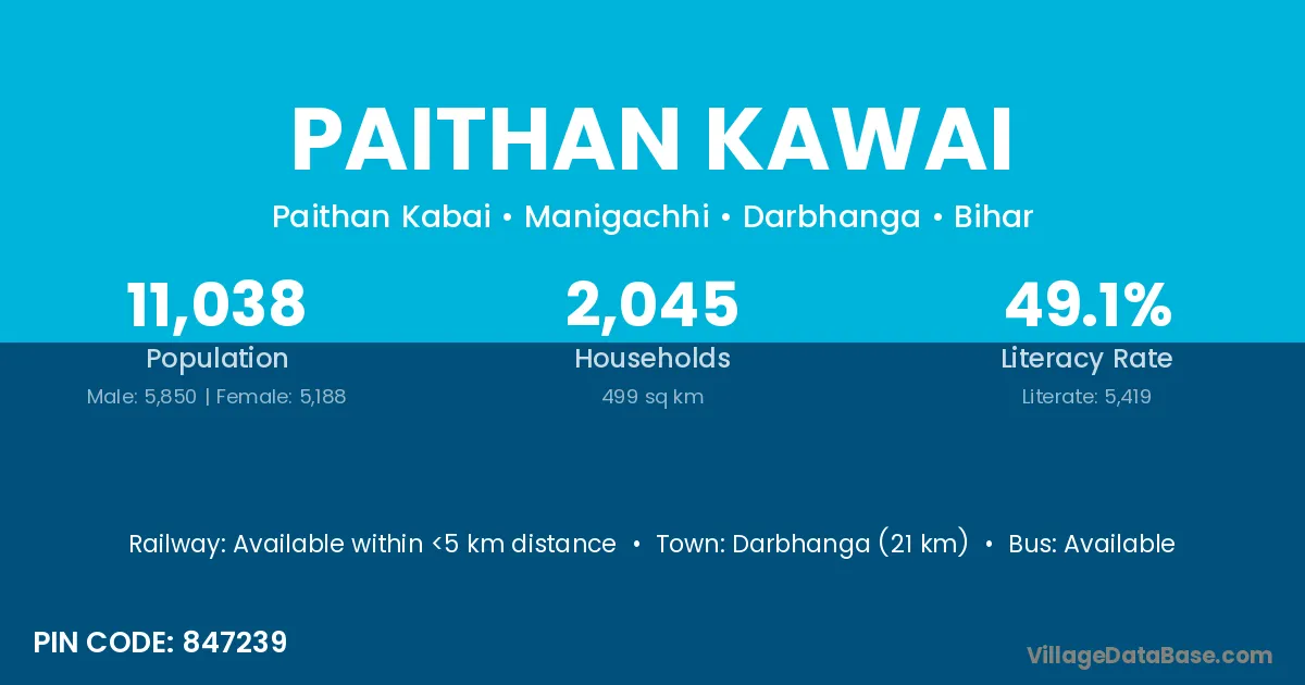 Darbhanga (21 km) is the nearest town to Paithan Kawai village for major economic activities and is located approximately 21 km away.