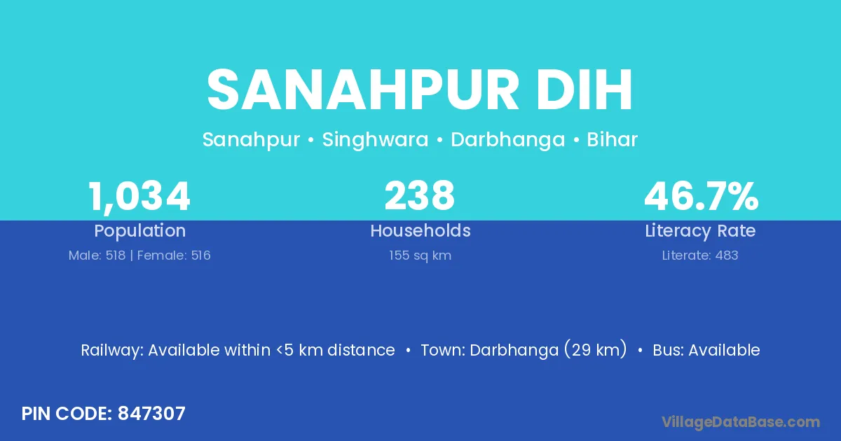 Darbhanga (29 km) is the nearest town to Sanahpur Dih village for major economic activities and is located approximately 29 km away.