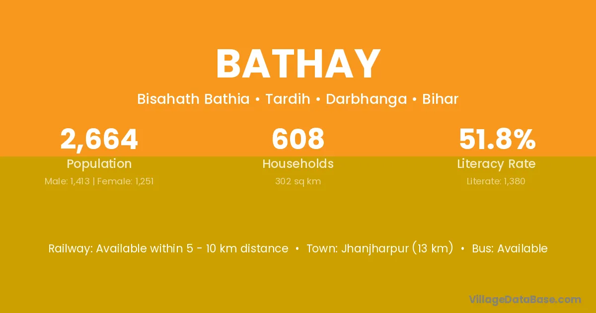 Jhanjharpur (13 km) is the nearest town to Bathay village for major economic activities and is located approximately 13 km away.