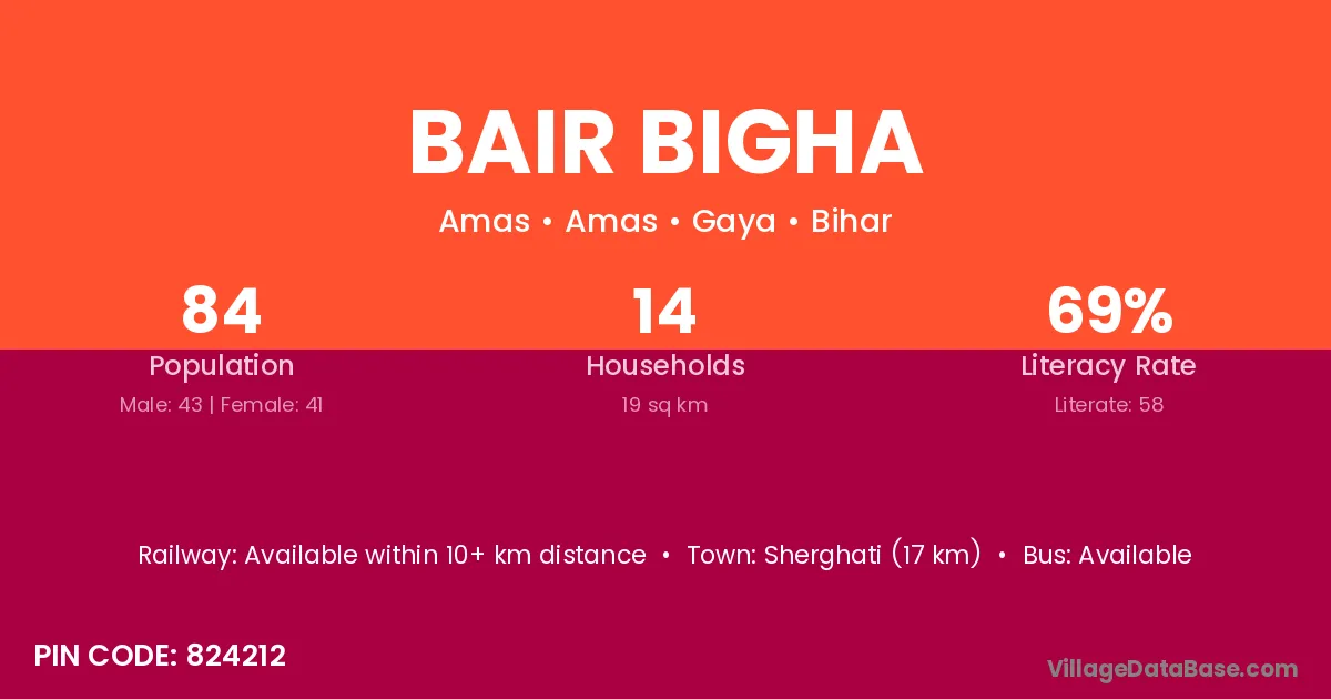 Sherghati (17 km) is the nearest town to Bair Bigha village for major economic activities and is located approximately 17 km away.