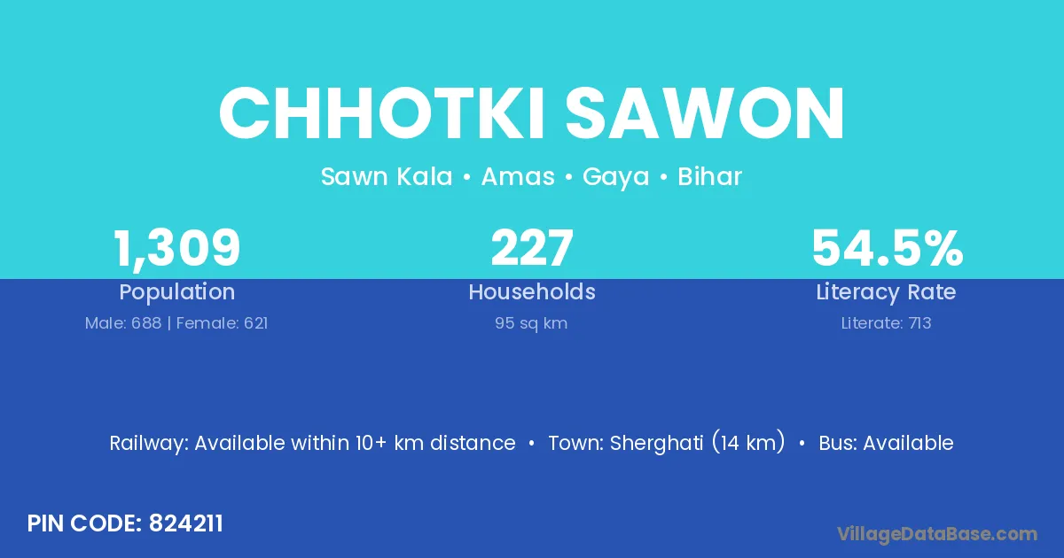 Sherghati (14 km) is the nearest town to Chhotki Sawon village for major economic activities and is located approximately 14 km away.