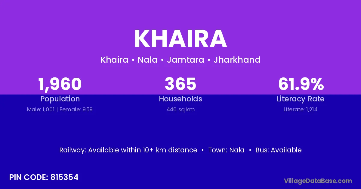 The literacy rate of Khaira village is 47.45%. Male literacy stands at 59.26% and female literacy at 33.43%.
