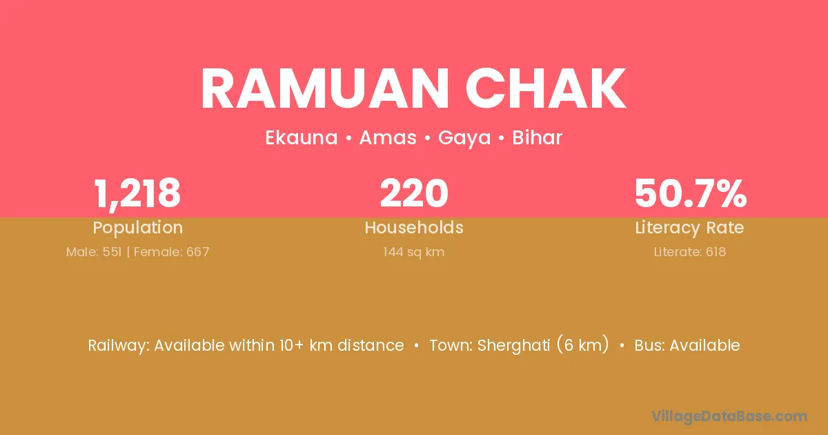 Sherghati (6 km) is the nearest town to Ramuan Chak village for major economic activities and is located approximately 6 km away.