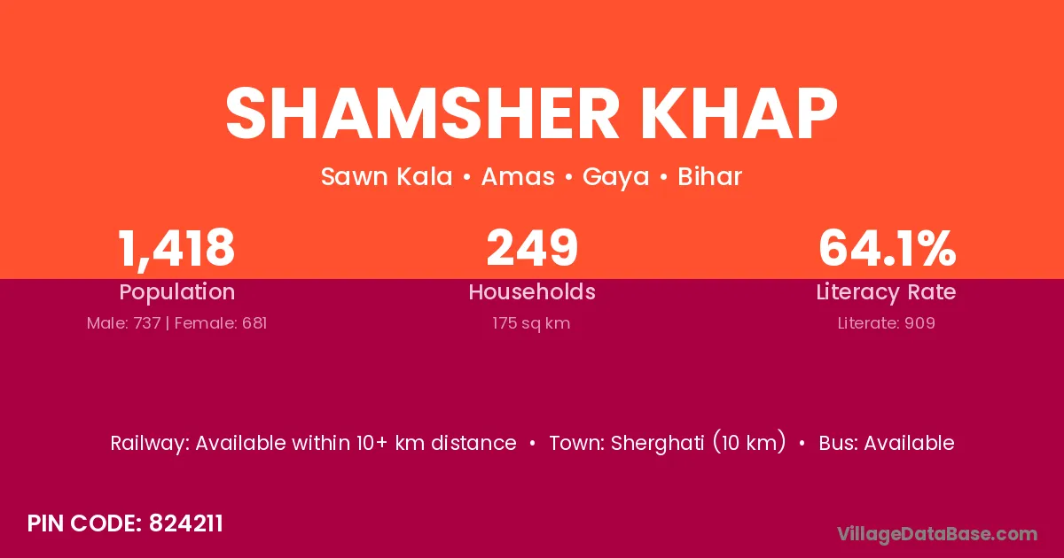 Sherghati (10 km) is the nearest town to Shamsher Khap village for major economic activities and is located approximately 10 km away.