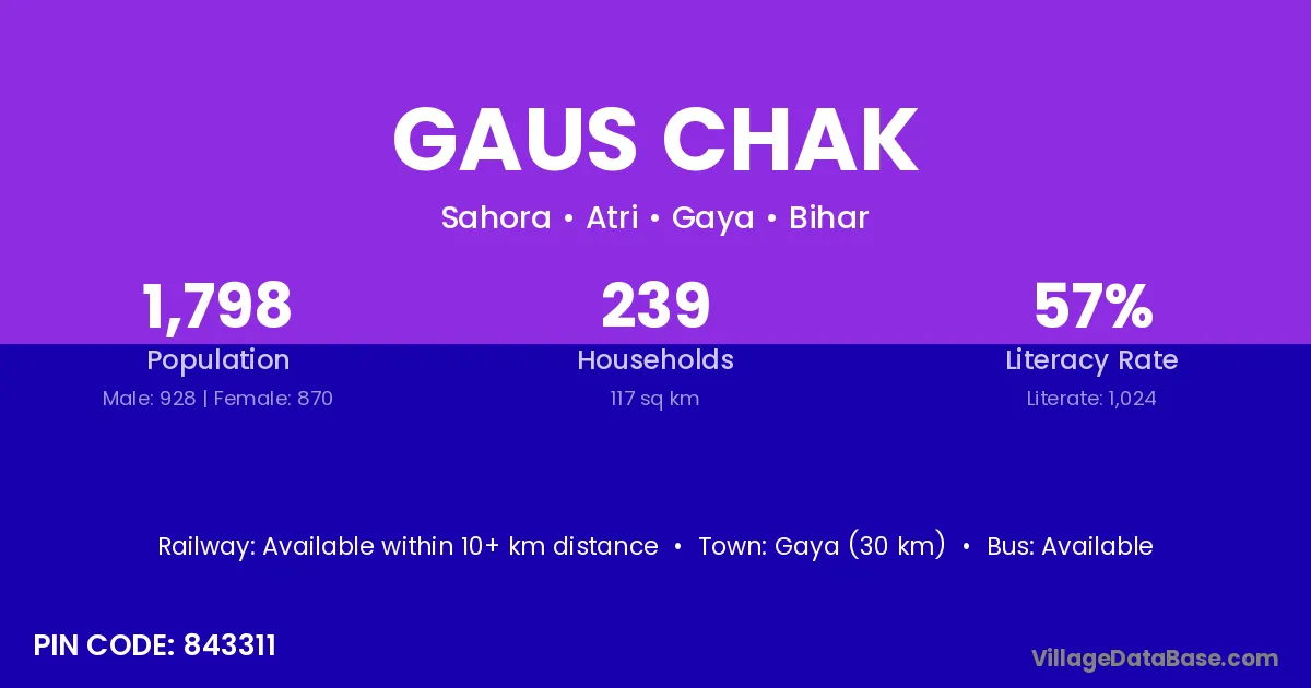 Gaya (30 km) is the nearest town to Gaus Chak village for major economic activities and is located approximately 30 km away.