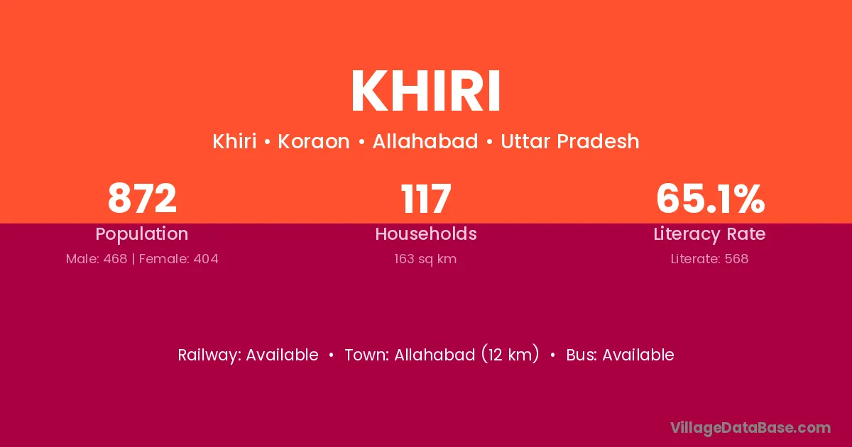 The literacy rate of Khiri village is 48.77%. Male literacy stands at 61.20% and female literacy at 34.89%.