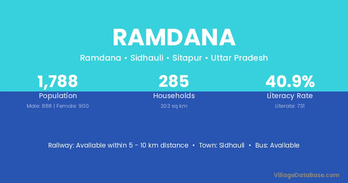 The literacy rate of Ramdana village is 40.74%. Male literacy stands at 50.52% and female literacy at 30.43%.