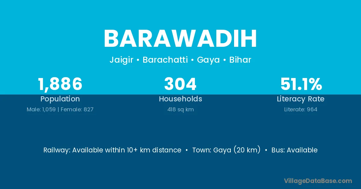 Gaya (20 km) is the nearest town to Barawadih village for major economic activities and is located approximately 20 km away.