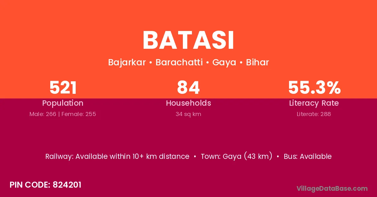 Gaya (43 km) is the nearest town to Batasi village for major economic activities and is located approximately 43 km away.