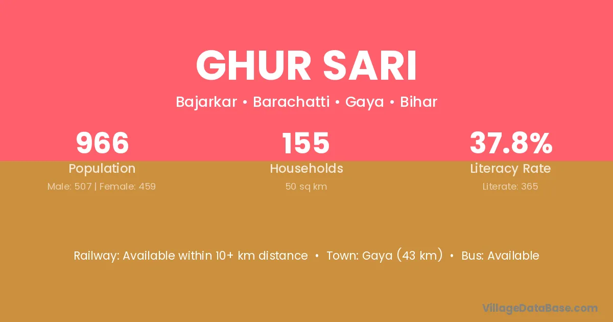 Gaya (43 km) is the nearest town to Ghur Sari village for major economic activities and is located approximately 43 km away.