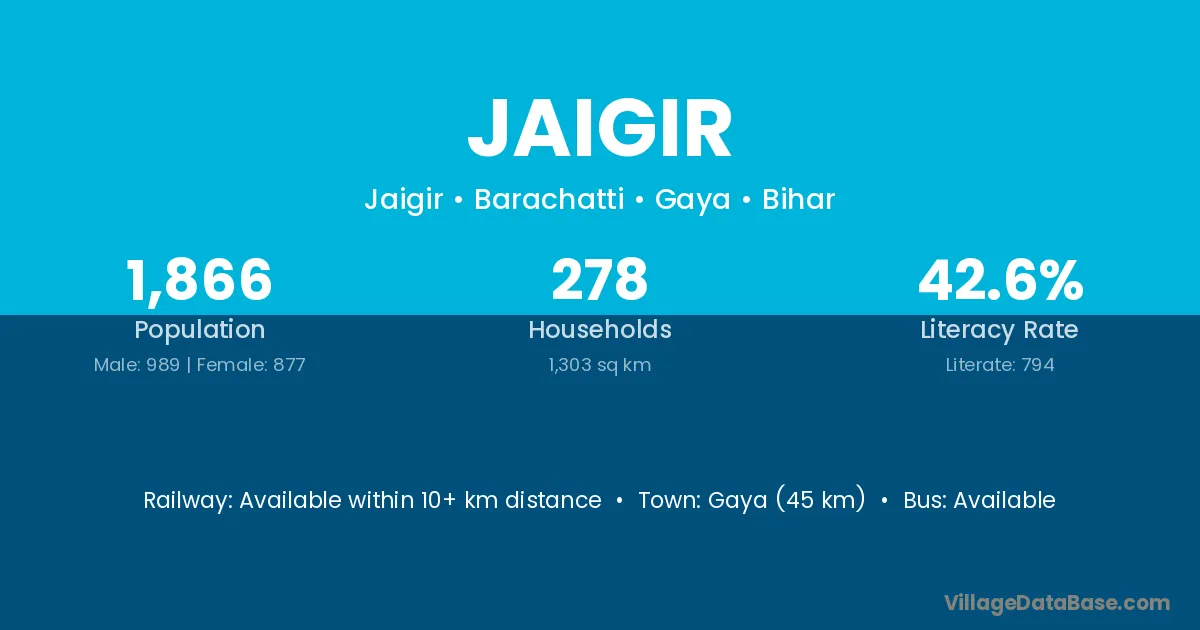 Gaya (45 km) is the nearest town to Jaigir village for major economic activities and is located approximately 45 km away.