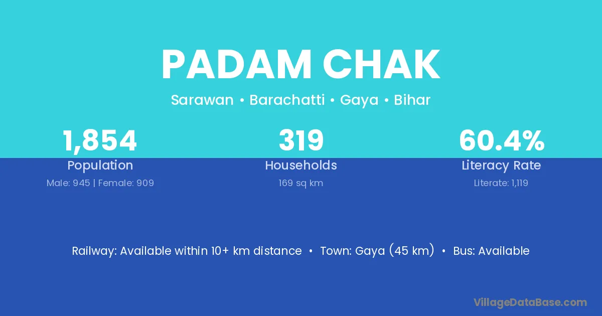Gaya (45 km) is the nearest town to Padam Chak village for major economic activities and is located approximately 45 km away.