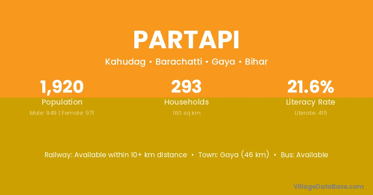 Gaya (46 km) is the nearest town to Partapi village for major economic activities and is located approximately 46 km away.