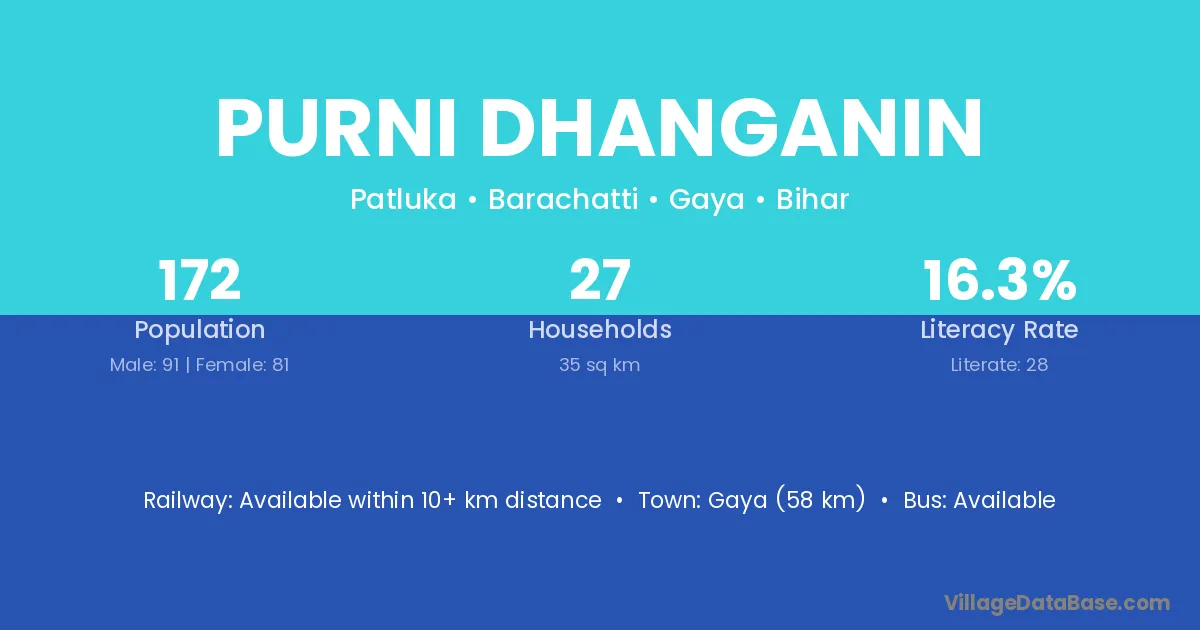Gaya (58 km) is the nearest town to Purni Dhanganin village for major economic activities and is located approximately 58 km away.