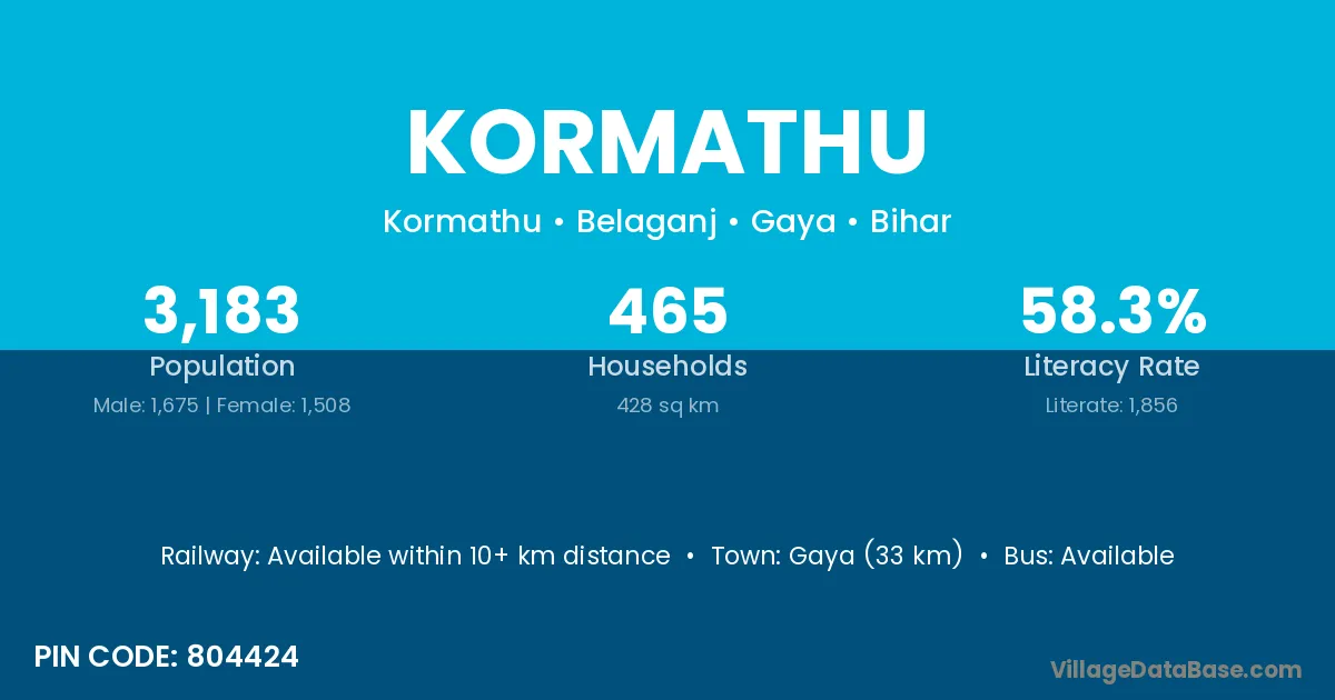 Gaya (33 km) is the nearest town to Kormathu village for major economic activities and is located approximately 33 km away.