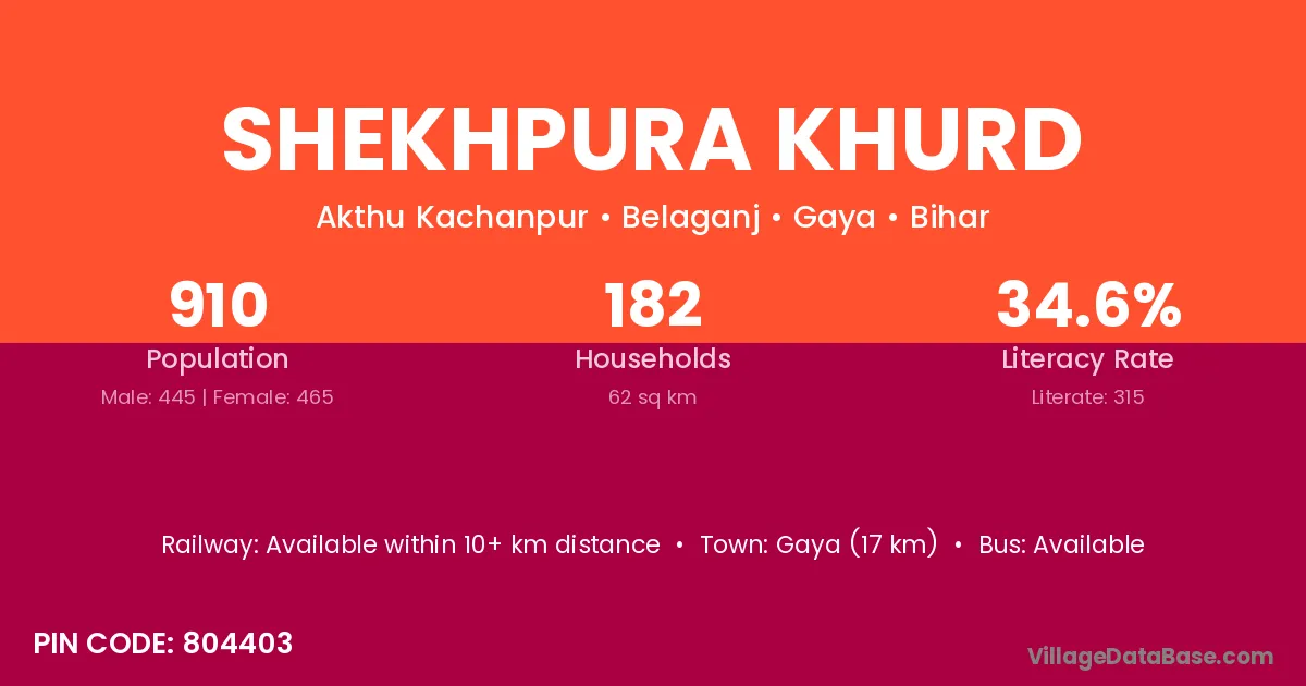 Gaya (17 km) is the nearest town to Shekhpura Khurd village for major economic activities and is located approximately 17 km away.