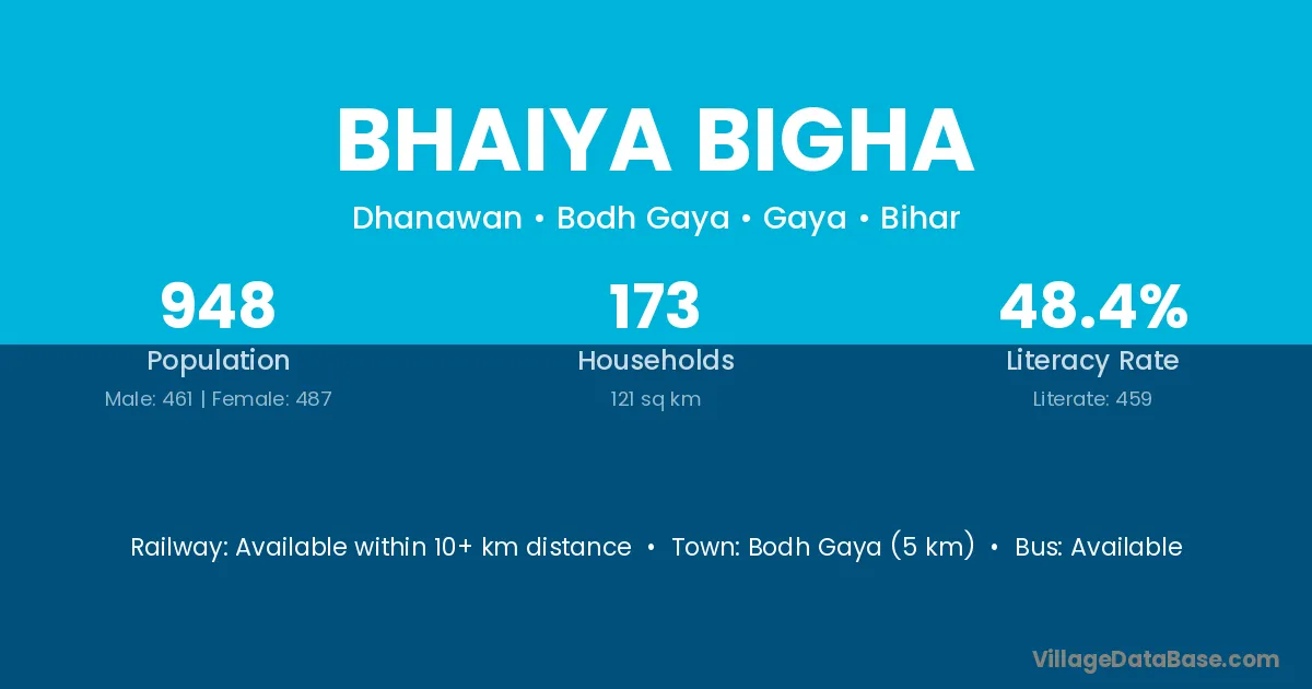 Bhaiya Bigha village has a total population of 948 people, of which 461 are males and 487 are females.