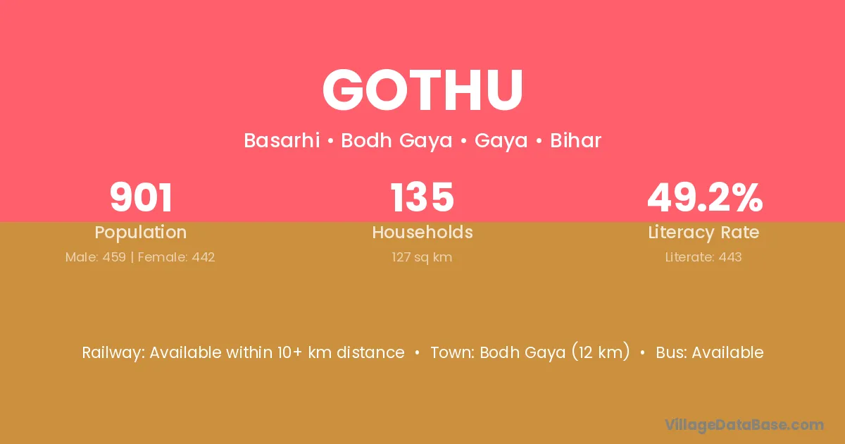 Bodh Gaya (12 km) is the nearest town to Gothu village for major economic activities and is located approximately 12 km away.