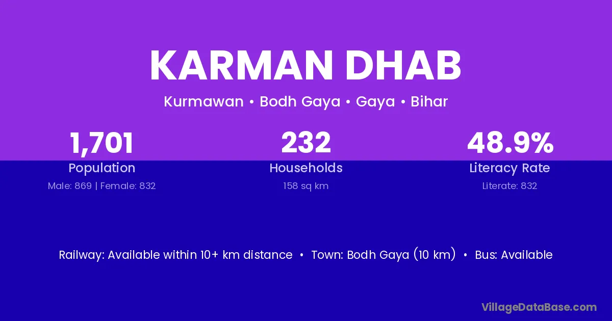 Bodh Gaya (10 km) is the nearest town to Karman Dhab village for major economic activities and is located approximately 10 km away.