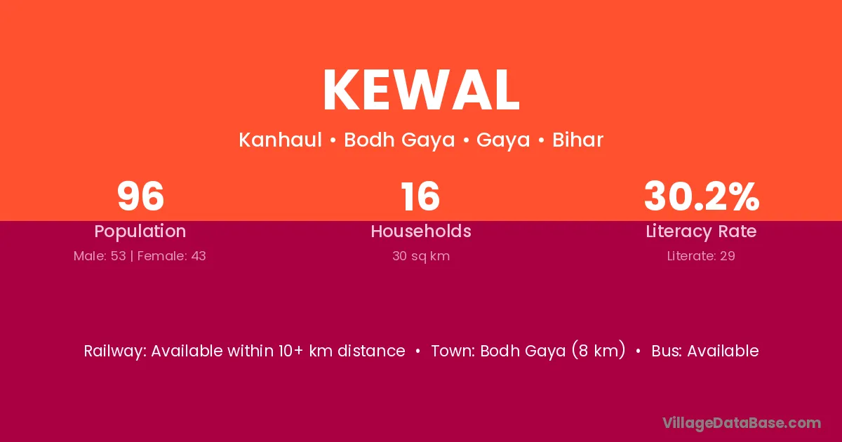 Bodh Gaya (8 km) is the nearest town to Kewal village for major economic activities and is located approximately 8 km away.