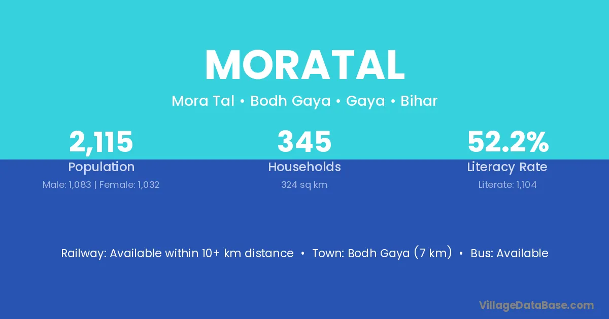 Bodh Gaya (7 km) is the nearest town to Moratal village for major economic activities and is located approximately 7 km away.