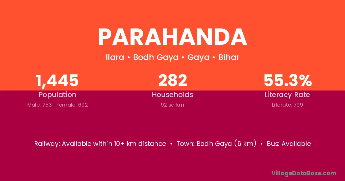 Bodh Gaya (6 km) is the nearest town to Parahanda village for major economic activities and is located approximately 6 km away.