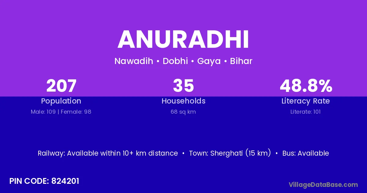 Sherghati (15 km) is the nearest town to Anuradhi village for major economic activities and is located approximately 15 km away.