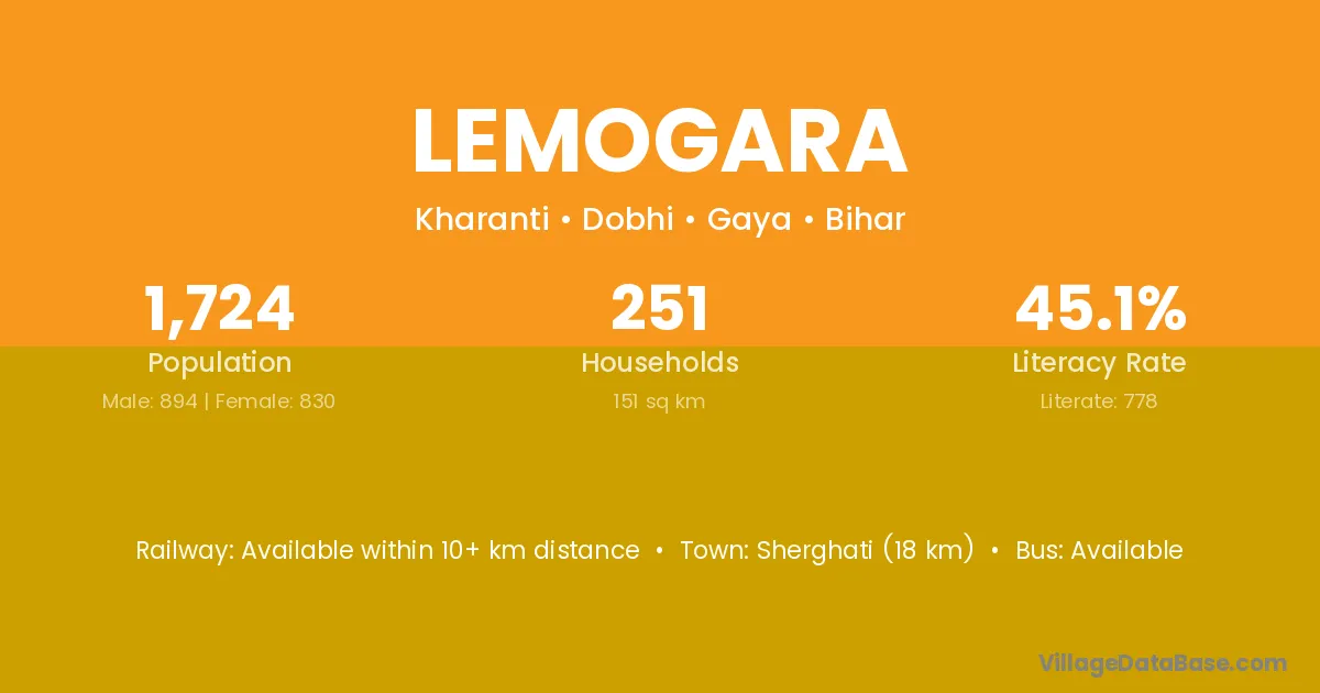 Sherghati (18 km) is the nearest town to Lemogara village for major economic activities and is located approximately 18 km away.