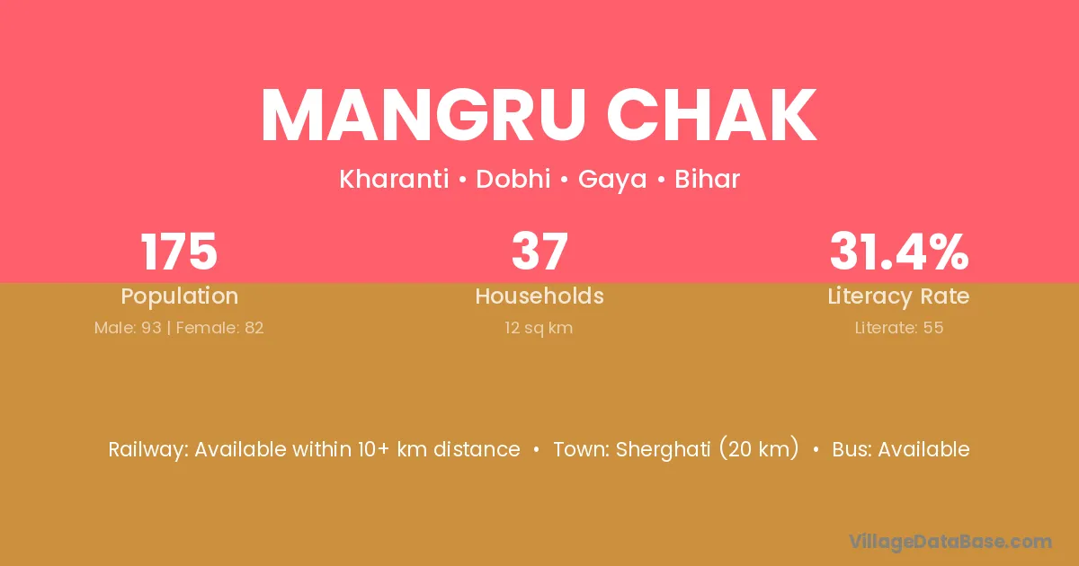 Sherghati (20 km) is the nearest town to Mangru Chak village for major economic activities and is located approximately 20 km away.