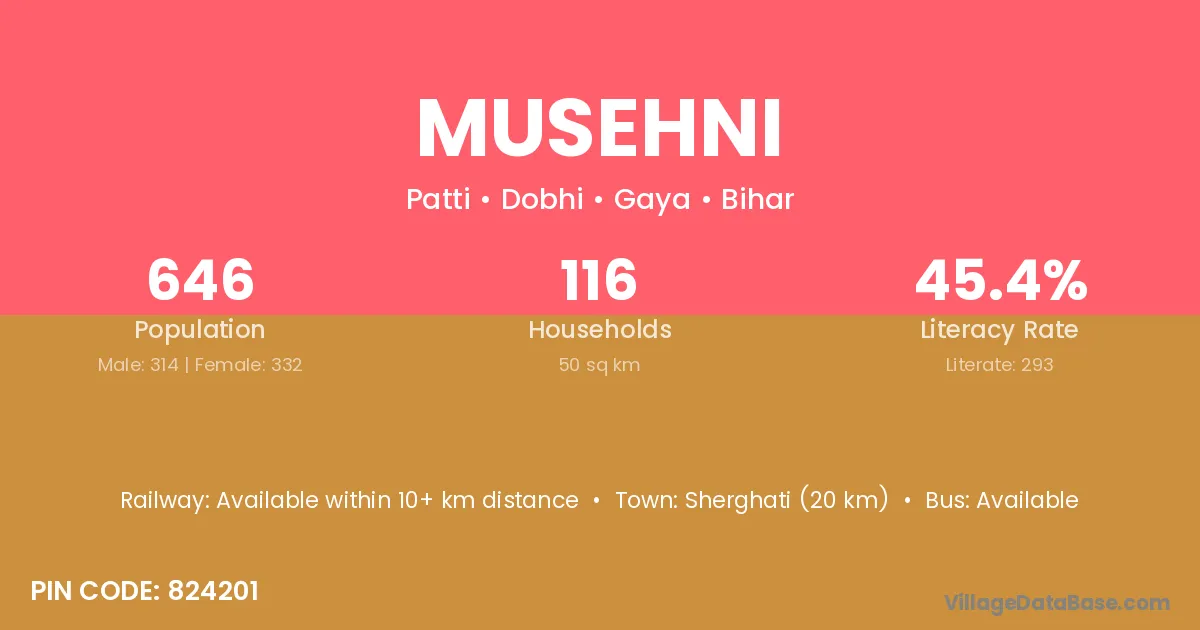 Sherghati (20 km) is the nearest town to Musehni village for major economic activities and is located approximately 20 km away.