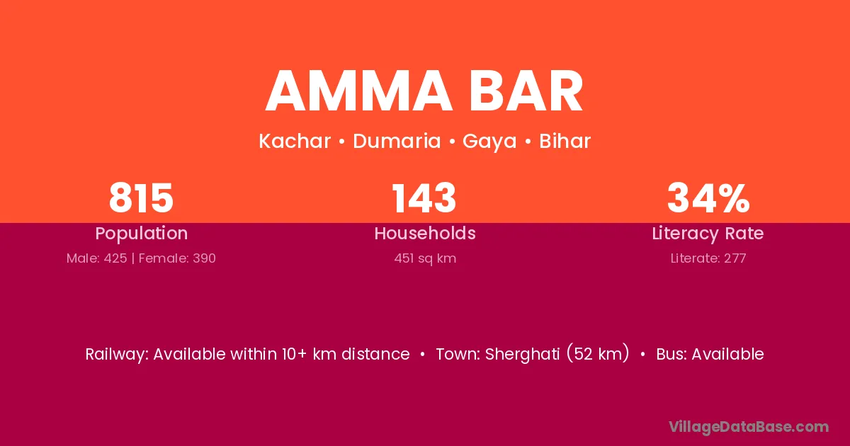 Sherghati (52 km) is the nearest town to Amma Bar village for major economic activities and is located approximately 52 km away.